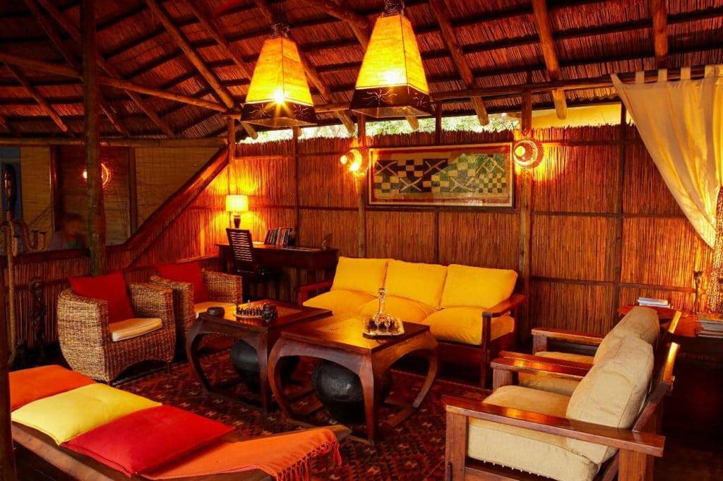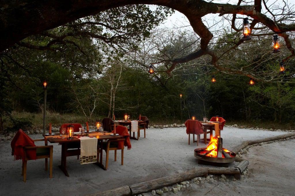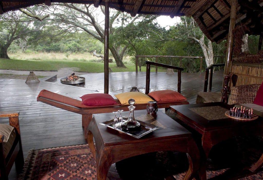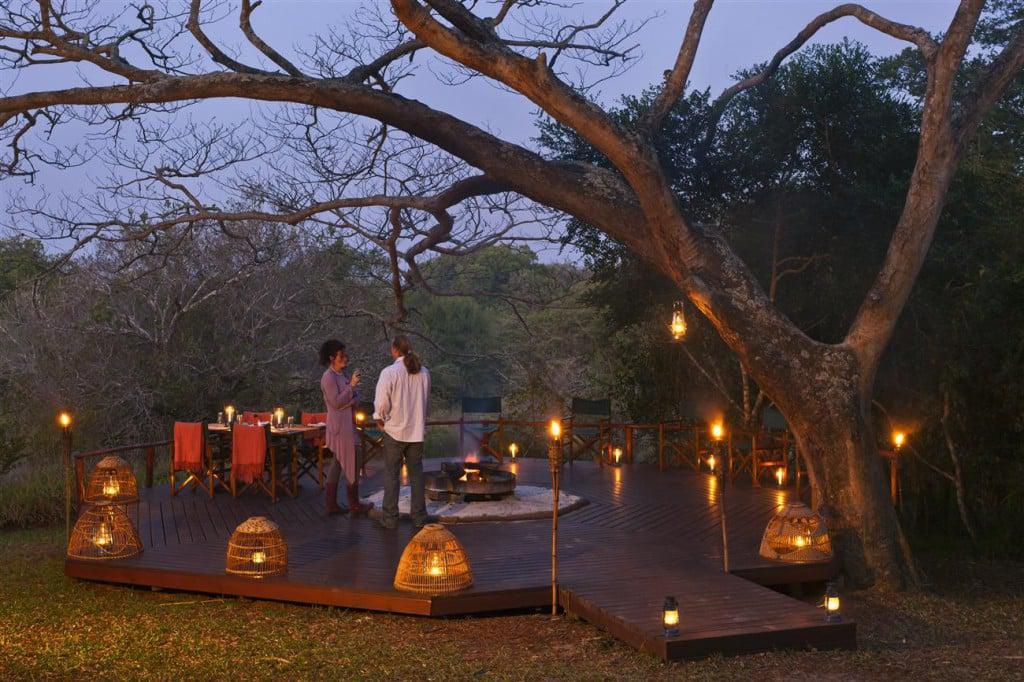 Guests are accommodated in thatched bedrooms, on raised wooden decks, hidden in the sand forest, with romantic outside bathrooms set under the lush leafy canopy. This is, as it should be, an Ecolological lodge with a gentle footprint. The lovely candle-lit meals are served outside on the terrace or in the Boma, a typical African circular stockage. Local school children often arrive to perform traditional Zulu dances.