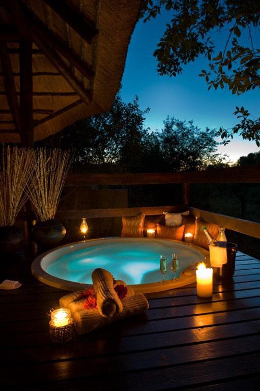 Each widely spaced-apart thatched suite, complete with its king-size bed and romantic, draped mosquito netting, is individually styled using African artifacts, beautiful wooden furnishings and luxurious linens. The deluxe en-suite bathrooms include both indoor and outdoor showers, while the new heated spa bath on each secluded deck offers a delightfully decadent vantage point from which to relax and enjoy nature.