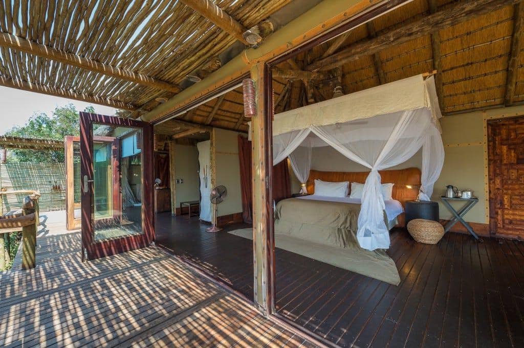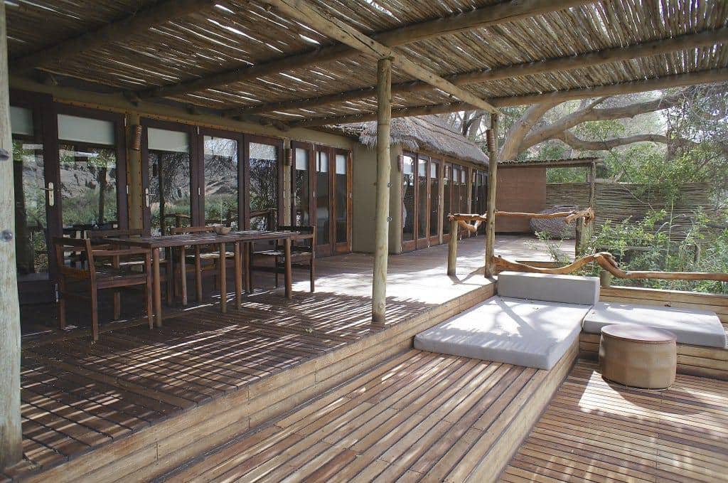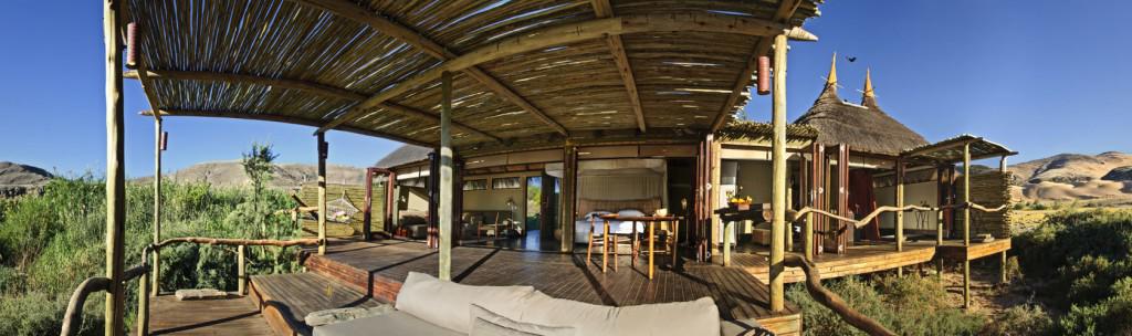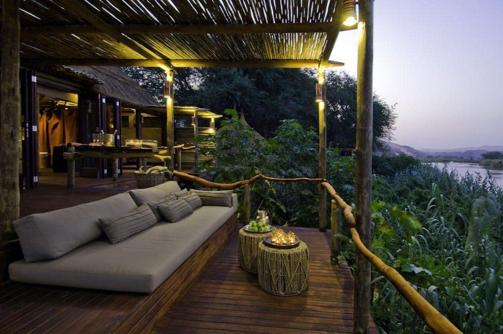 The camp consists of eight thatched villas, a main lounge area, indoor and outdoor dining areas, a library, curio shop, and a swimming pool nestled among albida trees. Each villa is exceptionally comfortable and consists of an en-suite bathroom, ceiling fans, mosquito nets, and elevated decks with beautiful views of the Kunene River.