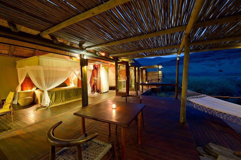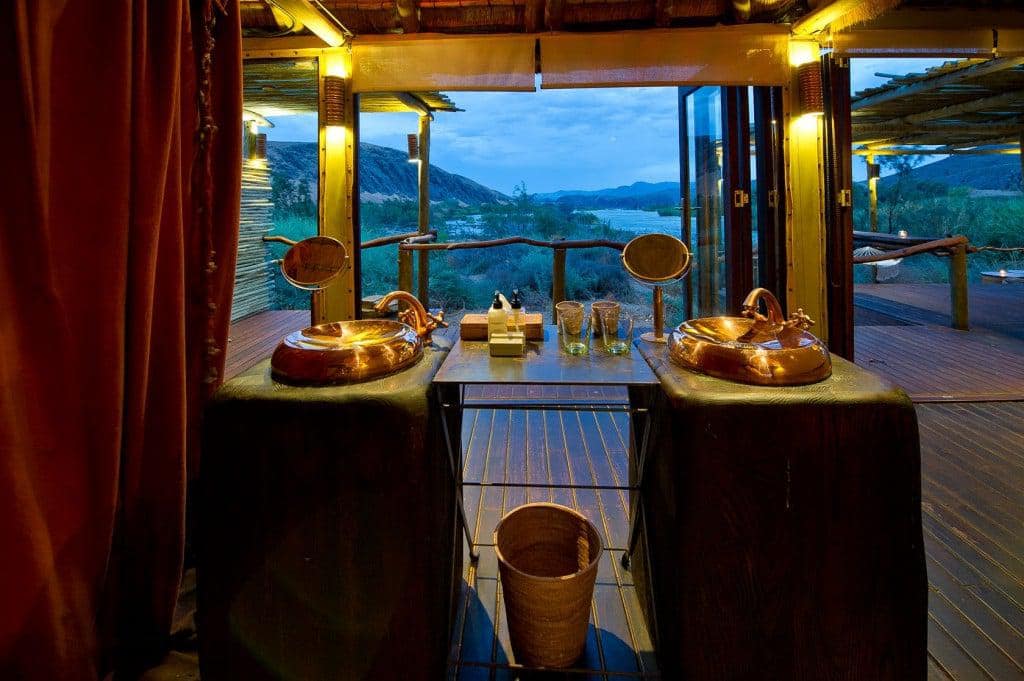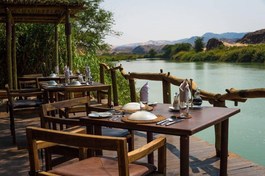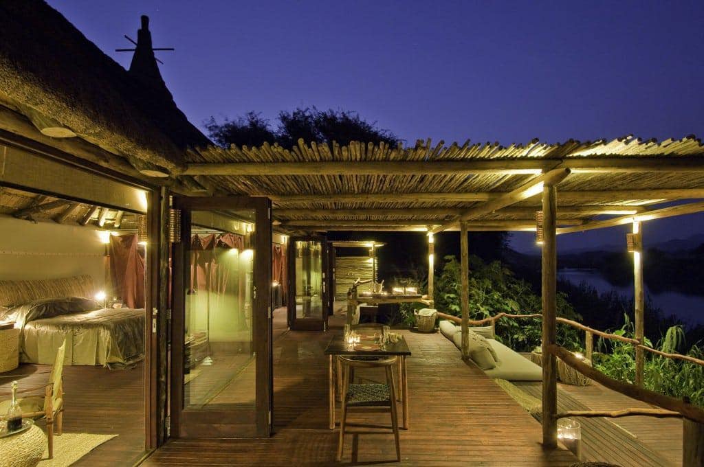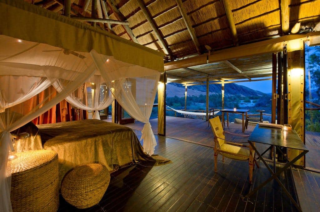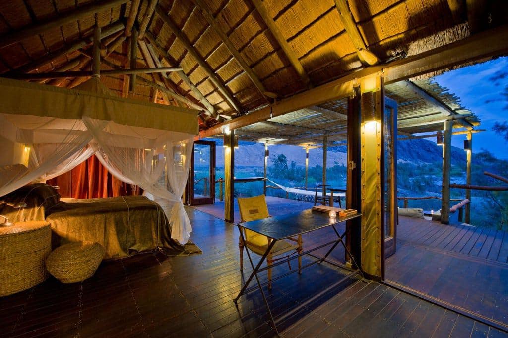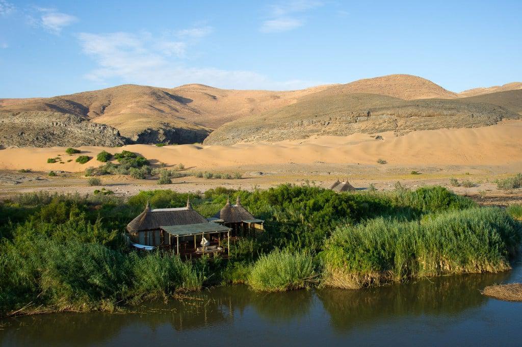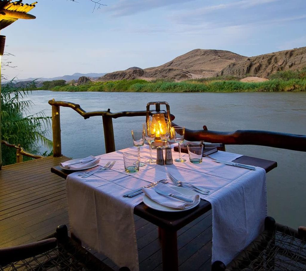 The Serra Cafema Camp is truly one of the most remarkable wilderness camps in the world. It is located in the north-west of Namibia on the fast-flowing Kunene River, which rushes past some of the most spectacular scenery in the world, and which is the border between Namibia and Angola. The camp is a haven of comfort in this rocky and desolate environment. It’s peaceful elegance blends into the natural desert surroundings where a visitor cannot but marvel at the splendour and solitude of the nature. It is reachable only by air.